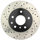 StopTech Drilled and Slotted Sport Rotors are 1-piece direct replacement brake discs for factory brake systems and stock calipers that look great behind your wheels – and offer significantly improved braking performance. The unique cross-drilling and slotting aids with heat and brake dust dispersal, prevents glazing of the pads, adds bite and improves wet and dry braking performance. Built to last, the black e-coating provides protection from corrosion and the high carbon metallurgy (in most applications) offers quieter operation, better crack resistance and increased performance.