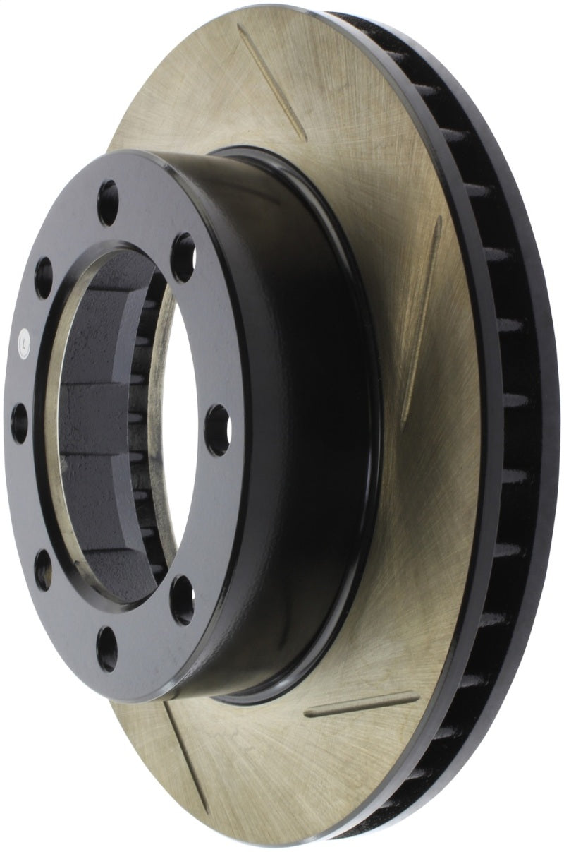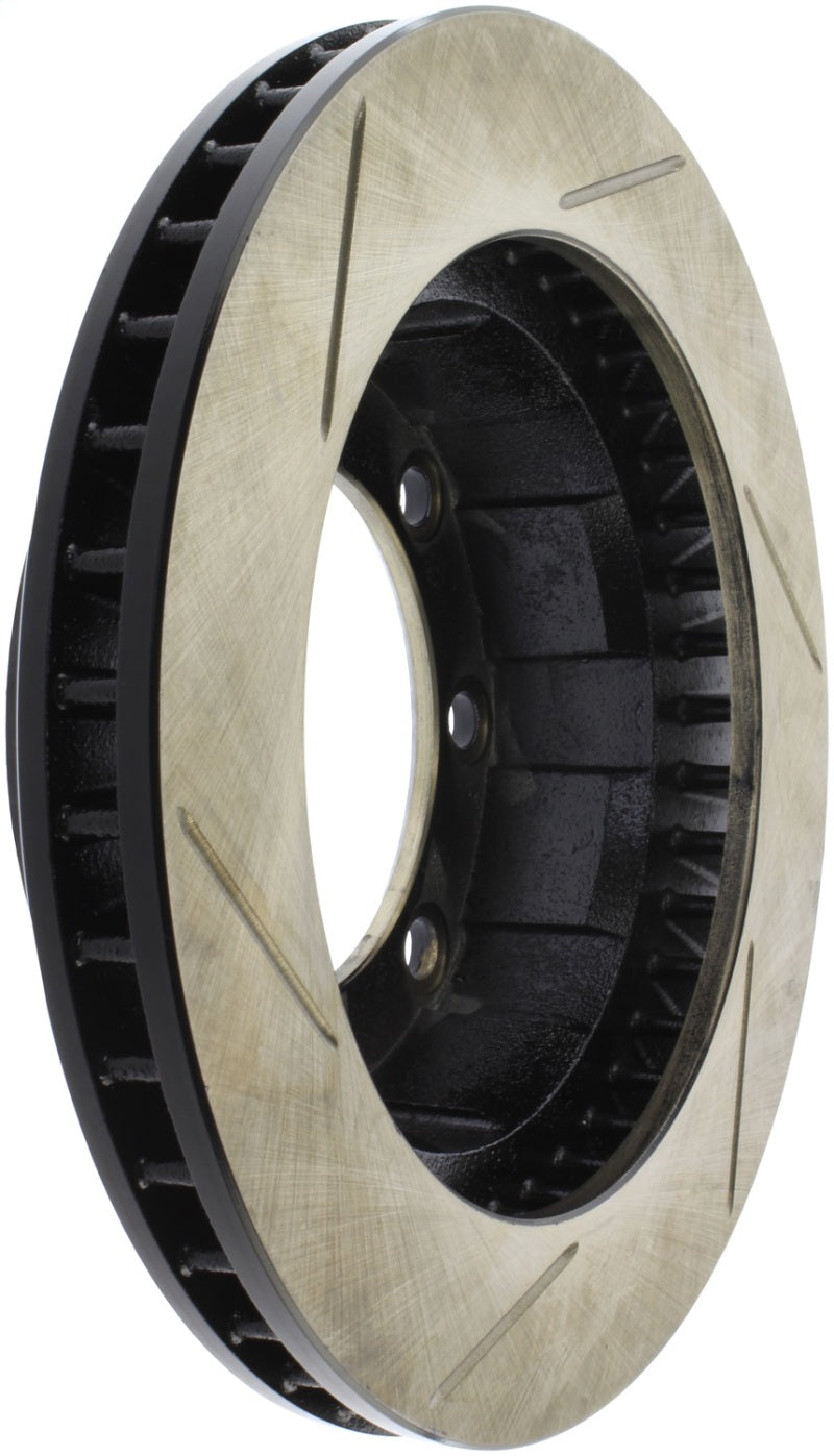 StopTech Slotted Sport Rotors are 1-piece direct replacement brake discs for factory brake systems and stock calipers that look great behind your wheels – and offer significantly improved braking performance. The unique slotting aids with heat and brake dust dispersal, prevents glazing of the pads, adds bite and improves wet and dry braking performance. Built to last, the black e-coating provides protection from corrosion and the high carbon metallurgy (in most applications) offers quieter operation, better crack resistance and increased performance.