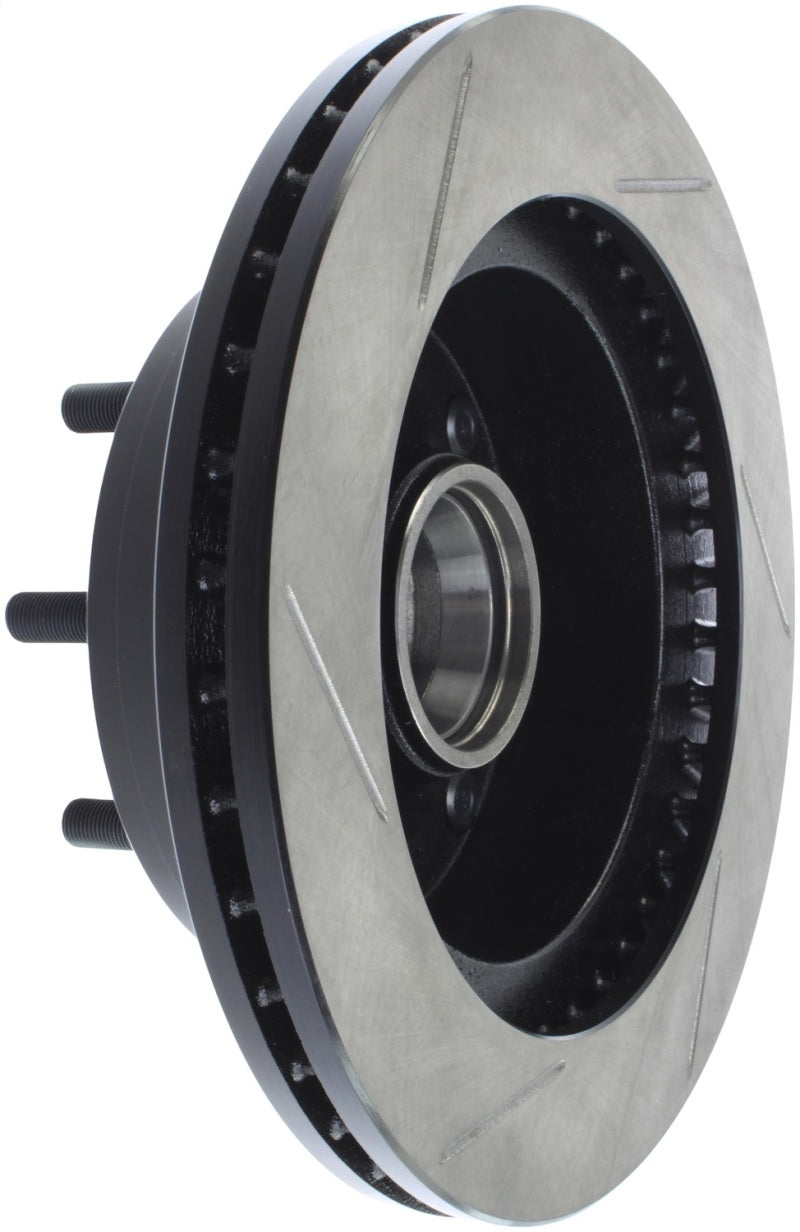 StopTech Slotted Sport Rotors are 1-piece direct replacement brake discs for factory brake systems and stock calipers that look great behind your wheels – and offer significantly improved braking performance. The unique slotting aids with heat and brake dust dispersal, prevents glazing of the pads, adds bite and improves wet and dry braking performance. Built to last, the black e-coating provides protection from corrosion and the high carbon metallurgy (in most applications) offers quieter operation, better crack resistance and increased performance.
