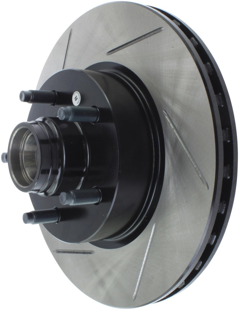 StopTech Slotted Sport Rotors are 1-piece direct replacement brake discs for factory brake systems and stock calipers that look great behind your wheels – and offer significantly improved braking performance. The unique slotting aids with heat and brake dust dispersal, prevents glazing of the pads, adds bite and improves wet and dry braking performance. Built to last, the black e-coating provides protection from corrosion and the high carbon metallurgy (in most applications) offers quieter operation, better crack resistance and increased performance.