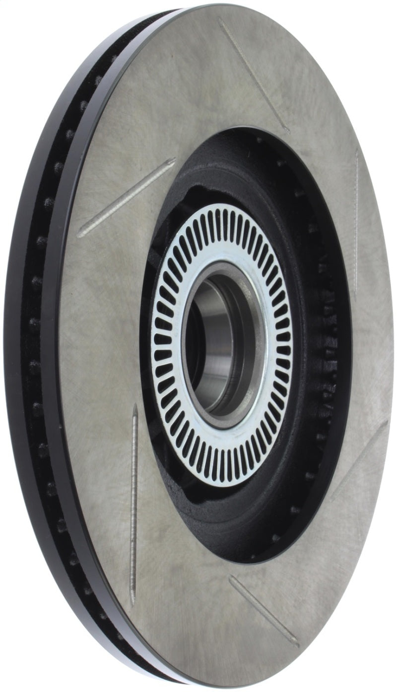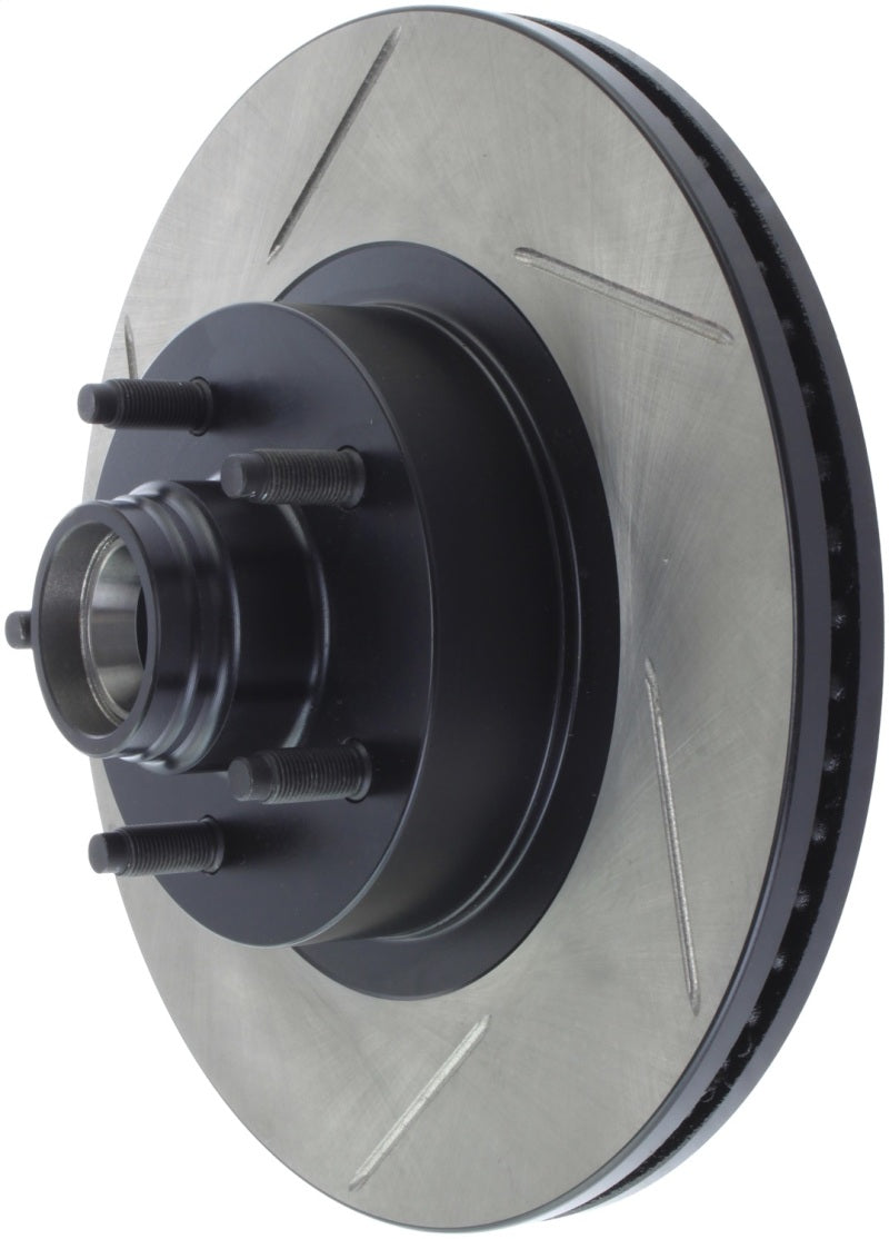 StopTech Slotted Sport Rotors are 1-piece direct replacement brake discs for factory brake systems and stock calipers that look great behind your wheels – and offer significantly improved braking performance. The unique slotting aids with heat and brake dust dispersal, prevents glazing of the pads, adds bite and improves wet and dry braking performance. Built to last, the black e-coating provides protection from corrosion and the high carbon metallurgy (in most applications) offers quieter operation, better crack resistance and increased performance.