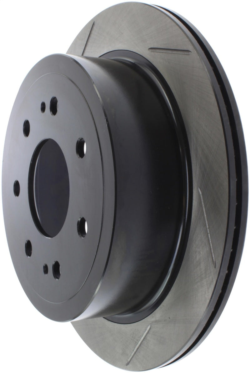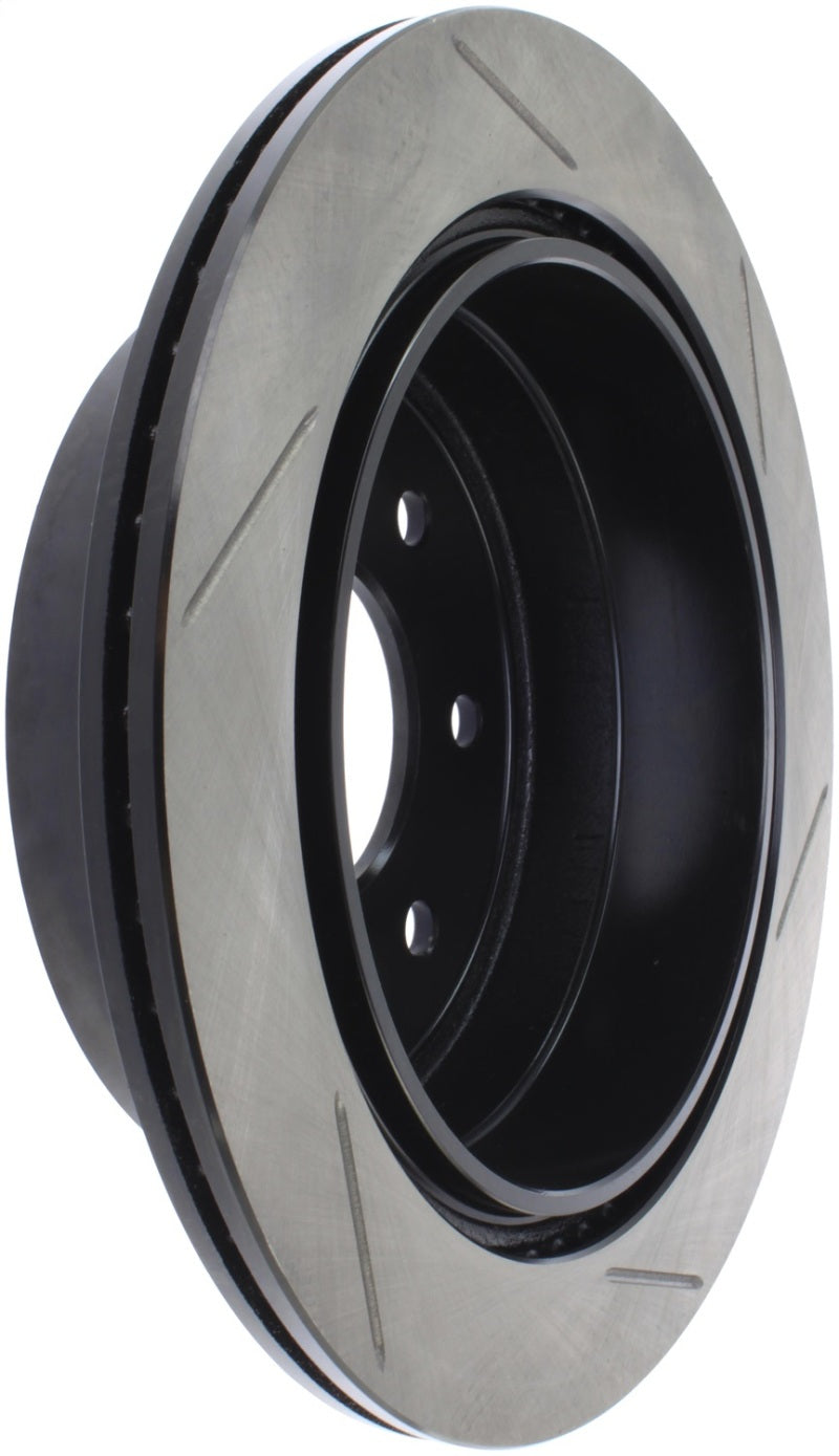StopTech Slotted Sport Rotors are 1-piece direct replacement brake discs for factory brake systems and stock calipers that look great behind your wheels – and offer significantly improved braking performance. The unique slotting aids with heat and brake dust dispersal, prevents glazing of the pads, adds bite and improves wet and dry braking performance. Built to last, the black e-coating provides protection from corrosion and the high carbon metallurgy (in most applications) offers quieter operation, better crack resistance and increased performance.