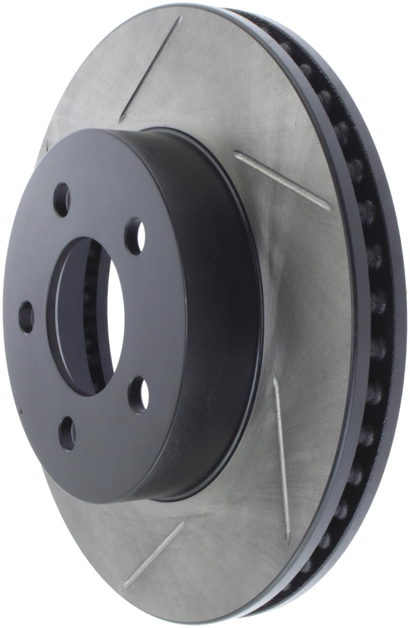 StopTech Slotted Sport Rotors are 1-piece direct replacement brake discs for factory brake systems and stock calipers that look great behind your wheels – and offer significantly improved braking performance. The unique slotting aids with heat and brake dust dispersal, prevents glazing of the pads, adds bite and improves wet and dry braking performance. Built to last, the black e-coating provides protection from corrosion and the high carbon metallurgy (in most applications) offers quieter operation, better crack resistance and increased performance.